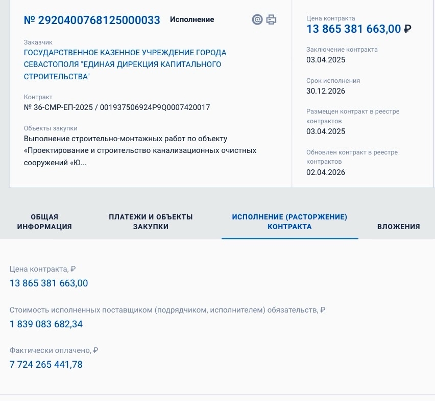 «А4 Новости» решили посмотреть на какой стадии исполнения находится контракт на «Проектирование и строительство канализационных очистных сооружений «Южные», г. Севастополь». Согласно данным системе ЕИС «Госзакупки» третий контракт был заключен 3 апреля 2025 года между ГКУ г. Севастополя «Единая дирекция капитального строительства» и симферопольской компанией ООО «Трансстройиндустрия». Стоимость завершения строительно-монтажных работ по объекту «Проектирование и строительство канализационных очистных сооружений «Южные», г. Севастополь» составляет 13,8 млрд рублей.