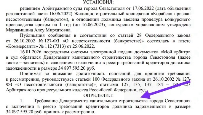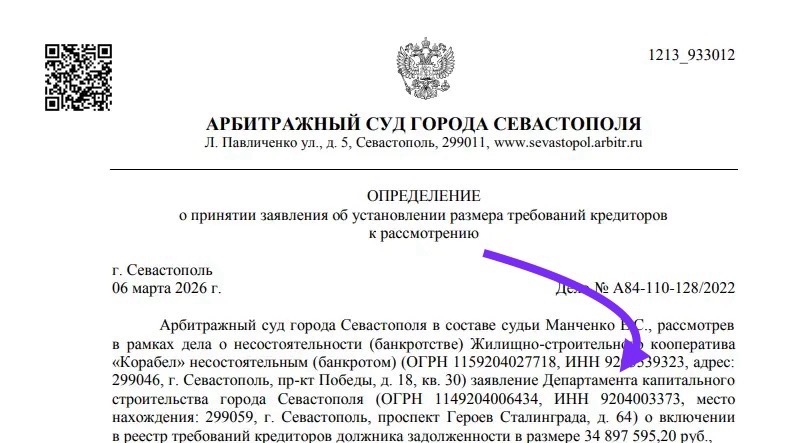 Сайт Арбитражного суда сообщает, что 16.01.2026 посредством системы электронной подачи документов «Мой арбитр» в суд обратился Департамент капитального строительства города Севастополя (далее также – заявитель) с заявлением о включении в реестр требований кредиторов должника задолженности в размере 34 897 595,20 руб. 6 марта 2026 года требование Департамента капитального строительства города Севастополя о включении в реестр требований кредиторов должника задолженности в размере 34 897 595,20 руб. принято к рассмотрению.