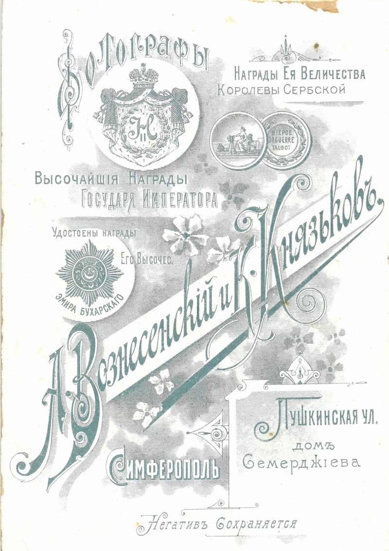 Вот у меня в руках одна из находок альбома: фотокарточка от симферопольских коллег Михаила Мазура – фотографов Анисима Вознесенского и Константина Князька начала ХХ века.