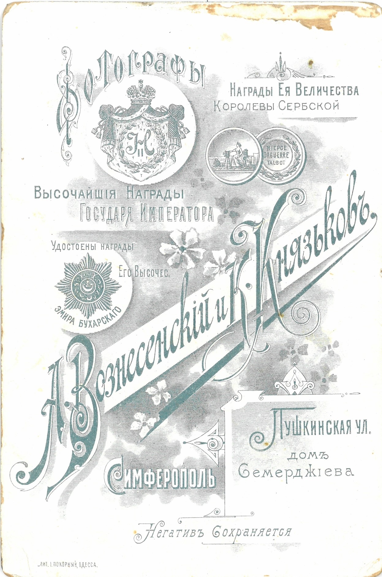 Слева еще одна гордая надпись: «Награды Ее Величества Королевы Сербской». Под надписью – изображение медали, которую несведущая публика принимала за награды на выставках. А это был распространенный рекламный ход, используемый практически всеми фотографами того времени. На аверсе изображена муза фотографии за аппаратом, на реверсе – фамилии изобретателей светописи: Ньепса, Дагерра и Тальбота, сразу троих. Я таких медалей, кстати, не помню, так как у М. П. Мазура всегда были три отдельных «медали» – с профилями отцов-основателей и их фамилиями на обороте. Как-то раз он даже напечатал бланк со своей фамилией среди корифеев.