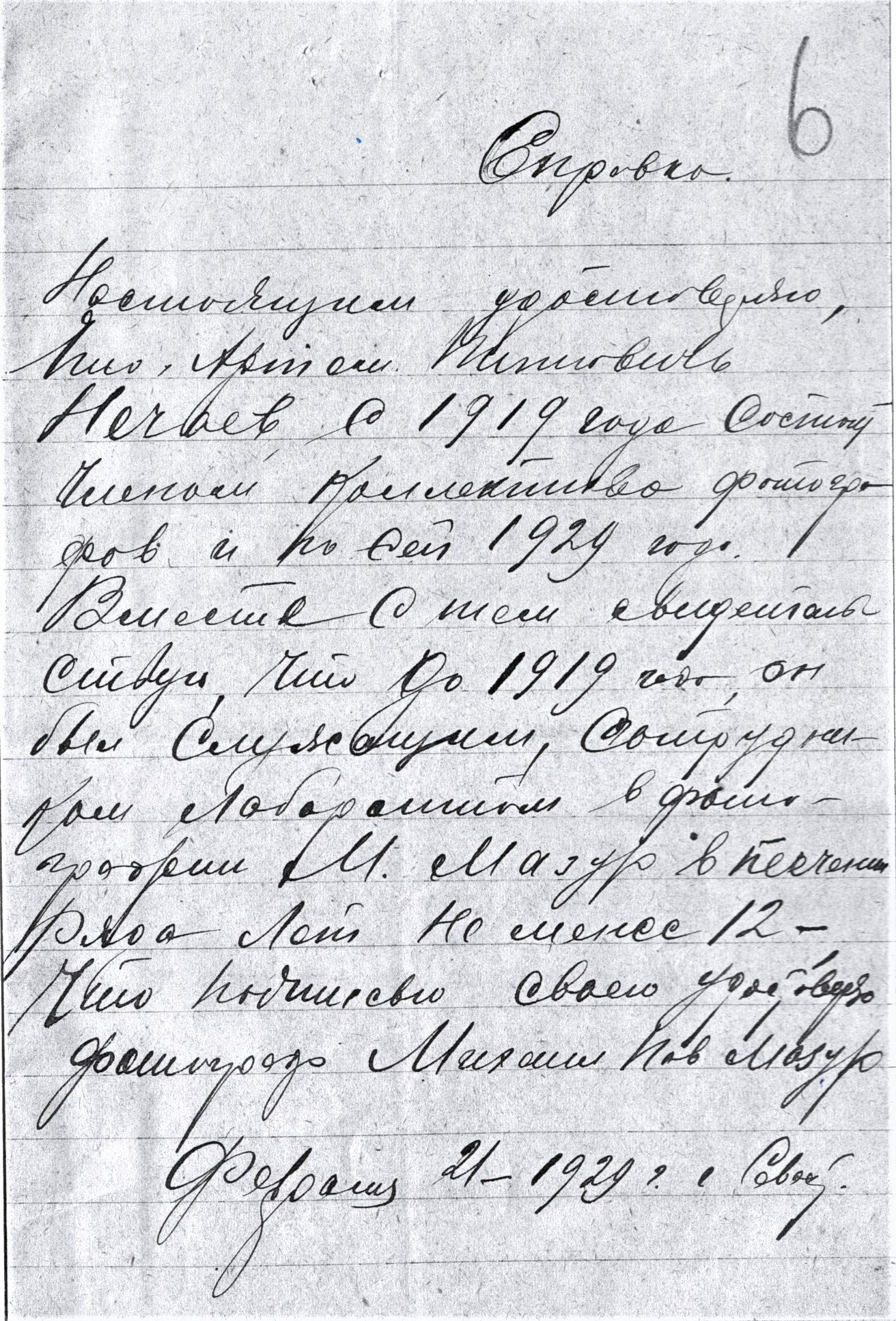 «Настоящим удостоверяю, что Артем Титович Нечаев с 1919 года состоит членом коллектива фотографов и по сей 1929 год. Вместе с тем свидетельствую, что до 1919 года он был служащим, сотрудником лаборатории в фотографии М. Мазура в течение ряда лет, не менее 12-ти, что подписью своею удостоверяет фотограф Михаил Павлович Мазур».