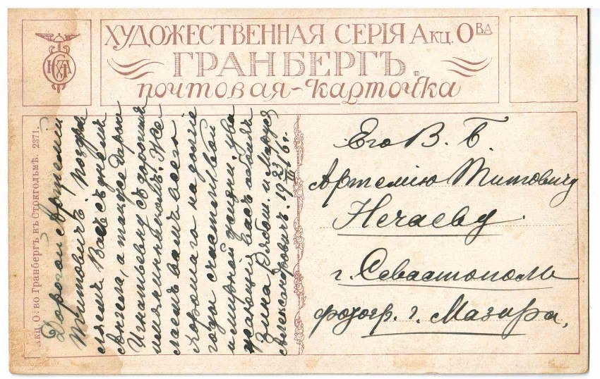 Когда я изучала открытки, вложенные в фотоальбом, я вдруг поняла: «Фотография Мазура» – это адрес! Там так и было написано, именно в разделе «адрес»: «Город Севастополь, Фотография Мазура, Нечаеву Артемию Титовичу».