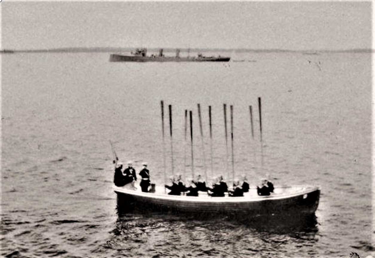 Взятие весел "на валек" практикуется при оказании почестей. А кому? В данном случае – Императору Николаю II, который проводил Высочайший смотр ученической эскадры Одесского учебного округа в Севастополе в сентябре 1911.